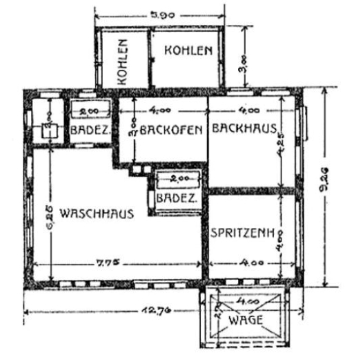 Budynek był dostępny nieodpłatnie dla wszystkich mieszkańców modelowej wsi. Mieściła się tu pralnia, dwie łazienki i ubikacja. W specjalnym pomieszczeniu stała sikawka pożarowa. Ganek z przodu (obecnie zabudowany) mieścił wagę do bydła. Być może najważniejszą funkcją była piekarnia, prowadzona przez dzierżawcę (Gerhard Kramer, mieszkający w domu obok). Za piecem chlebowym, z tyłu budynku, przewidziano skład węgla.