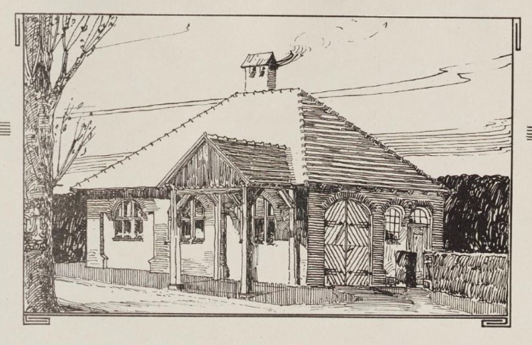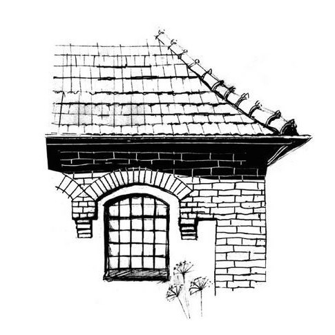 Detal starej remizy, na współczesnej grafice autorstwa golęczewskiej artystki Elżbiety Krenz