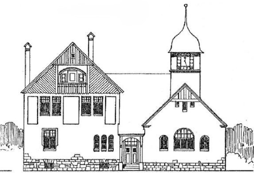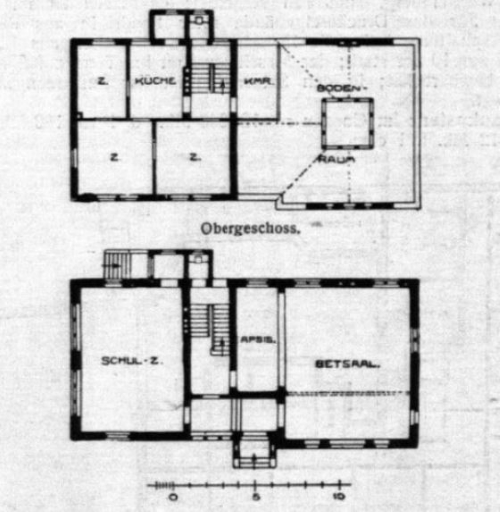Budynek składał się z części szkolnej (na lewo) i sali modlitewnej z półkolistymi oknami (na prawo) i wspólnym wejściem w łączniku.