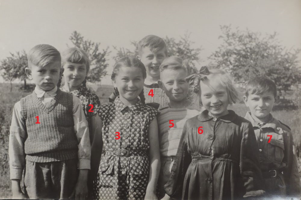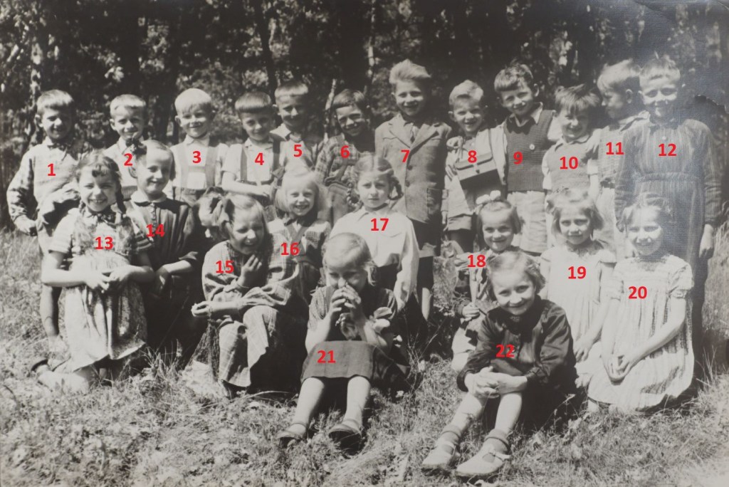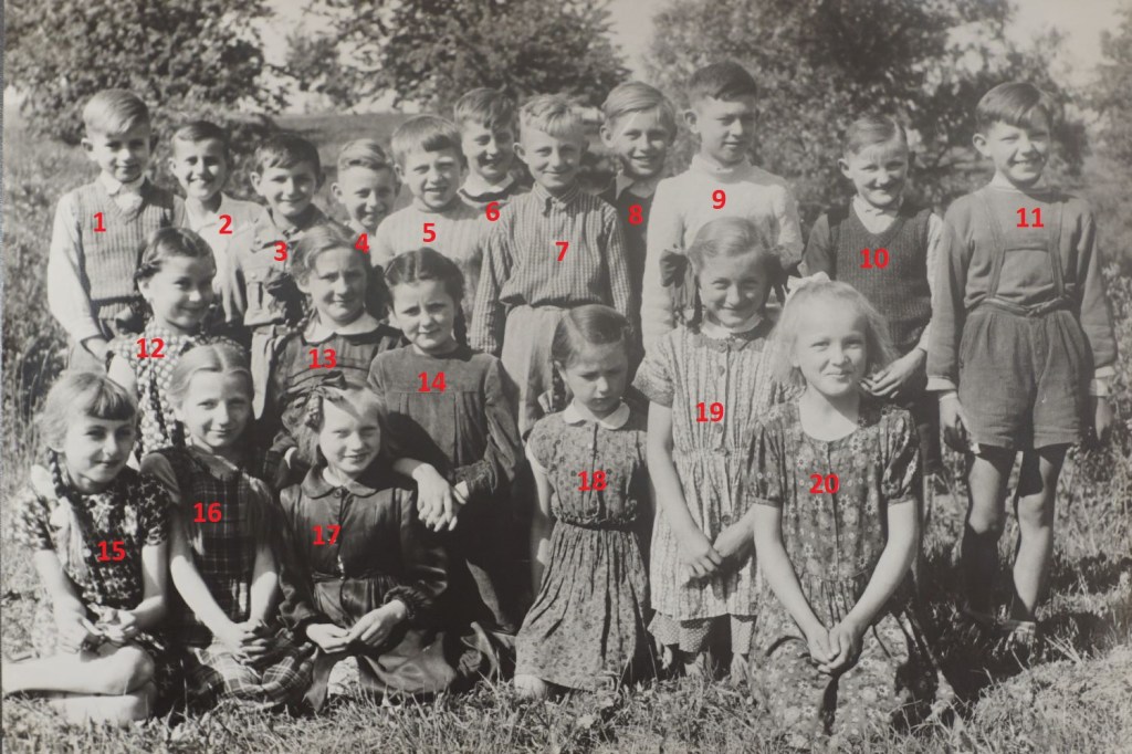 Zdjęcie z ok. 1955 r. (rocznik 1946) – udostępnione przez Angelikę Kulmińską. Opis na podstawie informacji od mieszkańców: B kierownik szkoły Stanisław Celuch; 1 – Jerzy Konarczyk, 3 – Czesław Krysiak, 5 – Stanisław Kozieł, 6 – Leonard Knaupe, 7 – Zdzisław Olech, 9 – Roman Żuberek lub Śpiewak, 11 – Jan Horemski, 12 – Ryszard Sroka, 13 – Tadeusz Anisimowicz, 14 – Jerzy Sroka, 15 – Stanisław Gomułka, 17 – Barbara Tamm, 22 – Maria Zamiara, 24 – Janina Gembiak